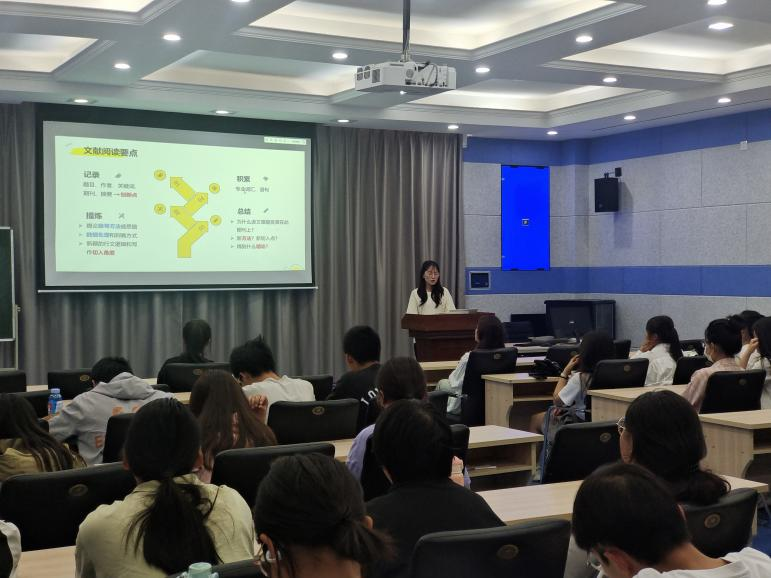 第二个环节由研究生党员师瑜分享她的科研经历,她先后从了解研究方向、学习专业知识、如何检索文献、如何快速判断其文献是否满足自己的需求、如何精读文章、找到创新点等方面分享了科研经验,对检索工具、阅读工具、管理文献工具等有哪些一一进行了列举供大家参考。她着重介绍了对于一篇文章要如何阅读,阅读完需要达到什么程度,并且可以从文章中学到什么,以提高同学们的学习能力。