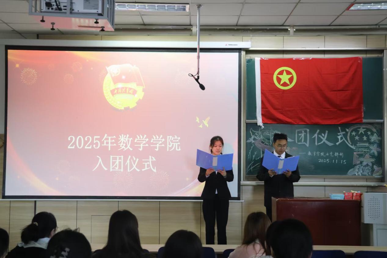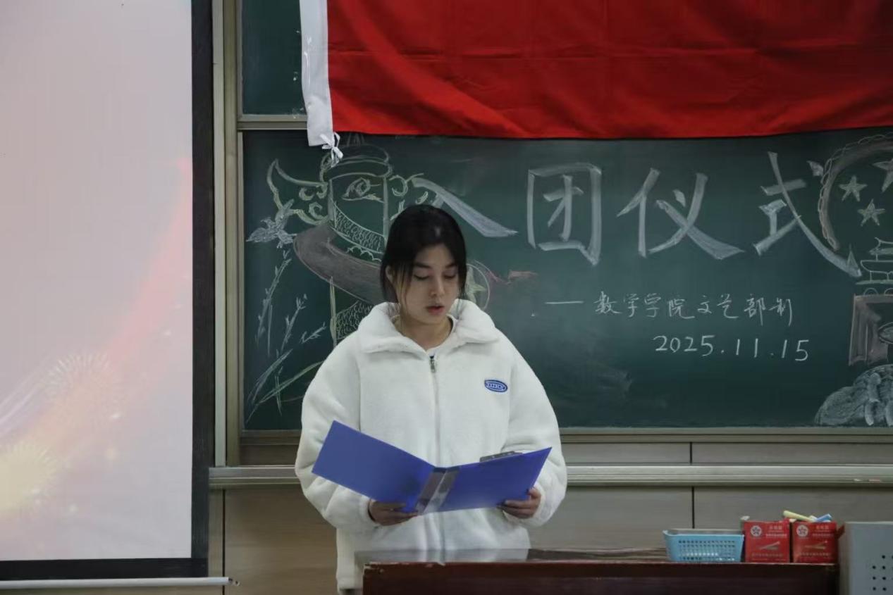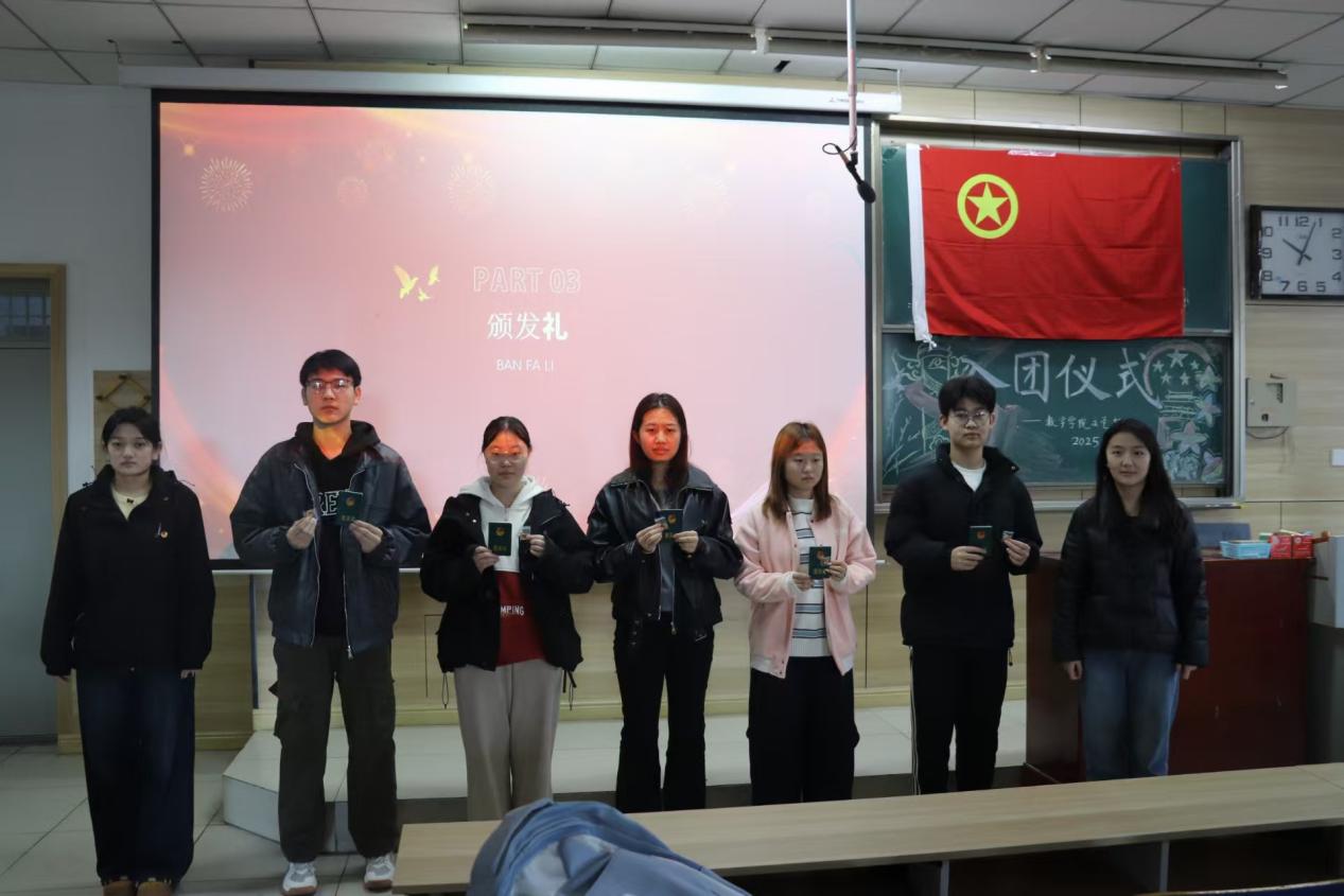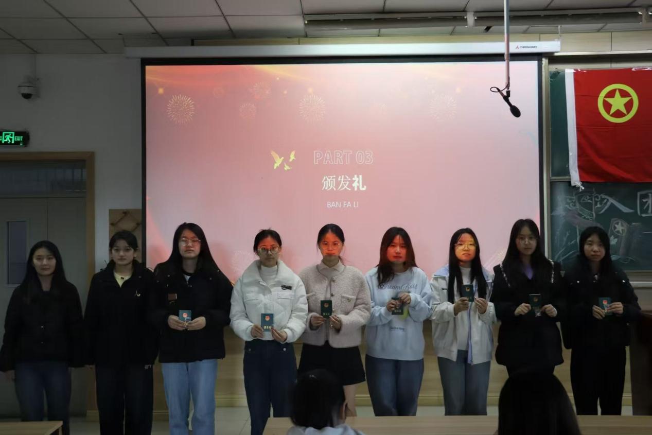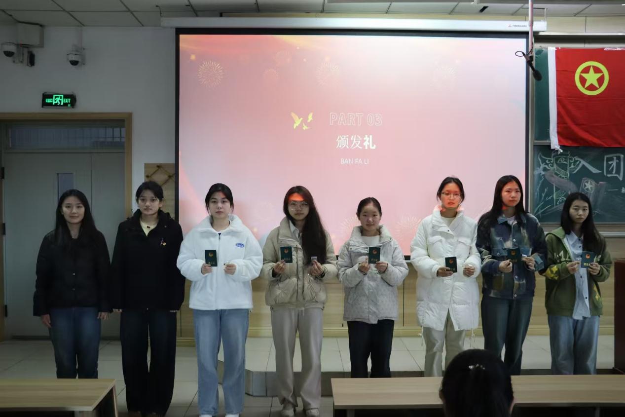 活动第三项,在热烈的掌声中,新团员代表们依次走上台,学生兼职团委副书记仝晓兰和团委组织部部长暴丽娟为他们颁发团员证和团徽。团徽熠熠生辉。这小小的团徽,不仅象征着一份沉甸甸的责任与使命,它将时刻提醒着新团员们,要以更高的标准要求自己,在思想和行动上都成为同学们的楷模。