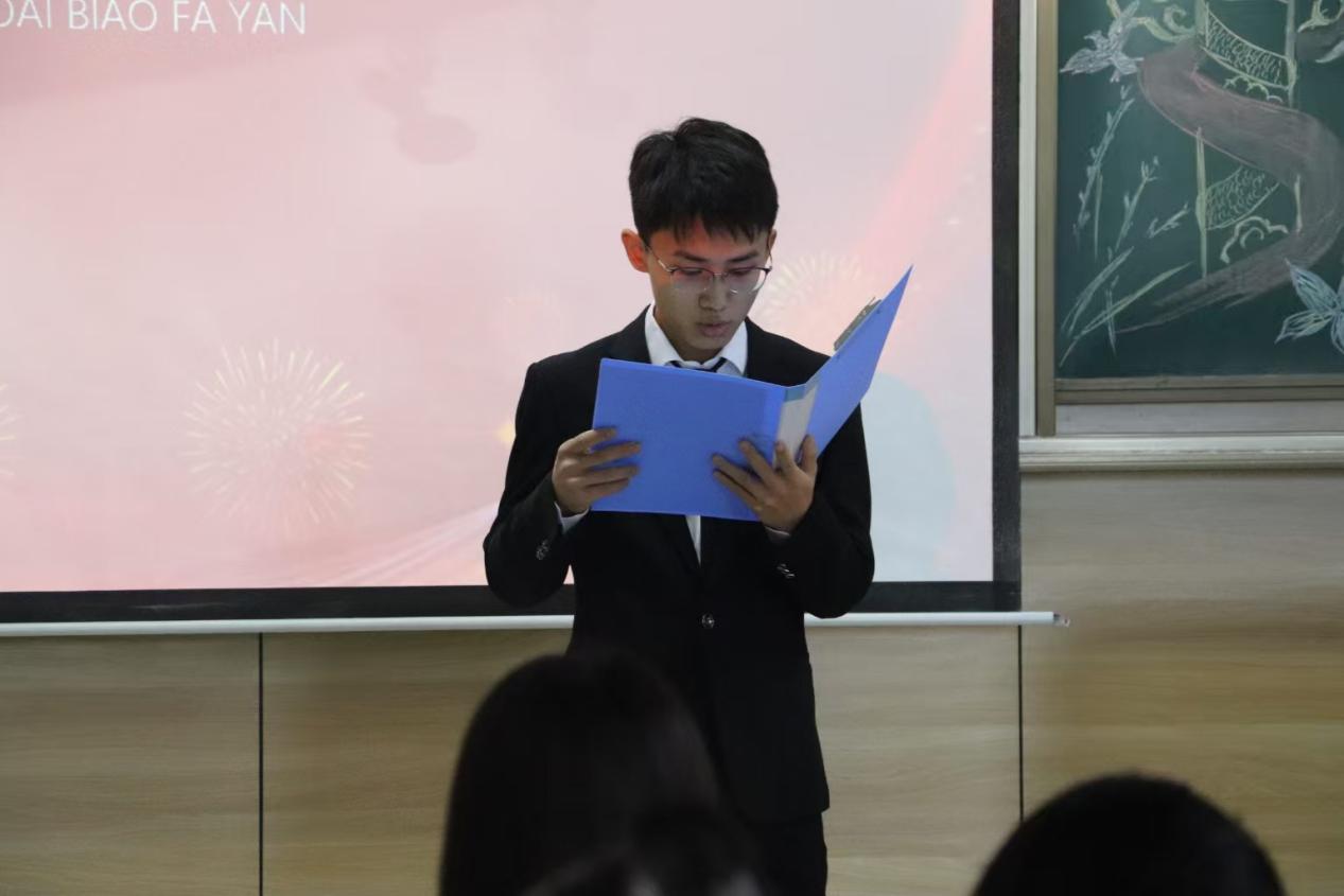 活动第六项,优秀团员代表张鹏远同学分享了自己在团组织中的成长经历与感悟,他讲述了自己在实践中收获成长,鼓励新团员们珍惜青春时光,勇于担当,积极参与社会实践和志愿服务活动,在共青团的大舞台上绽放绚丽光彩。