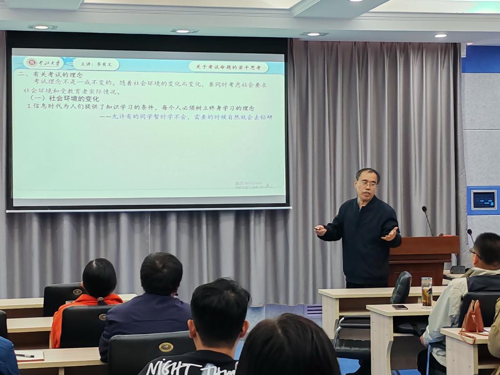 李老师从现代教育的理念、不同课程考试的分类、信息化时代对考试的新要求、新理念等方面对考试进行了深入剖析,指出考试的主要目的是查缺补漏,督促学习,因材施教,而不能作为唯一评价学生的方式,应该“重教学过程而轻考试”,阶段性的测试比结课后考试更为重要,而且考试形式不拘泥于试卷可以多样性。关于考试命题,李老师以公共基础课《高等数学》和《线性代数》为例,为大家详细讲解了不同类型考试的不同命题原则,重点突出学习过程,试题区分度要高。最后,所有教师针对自己教学和学生学习中出现的一些问题进行了讨论与交流。