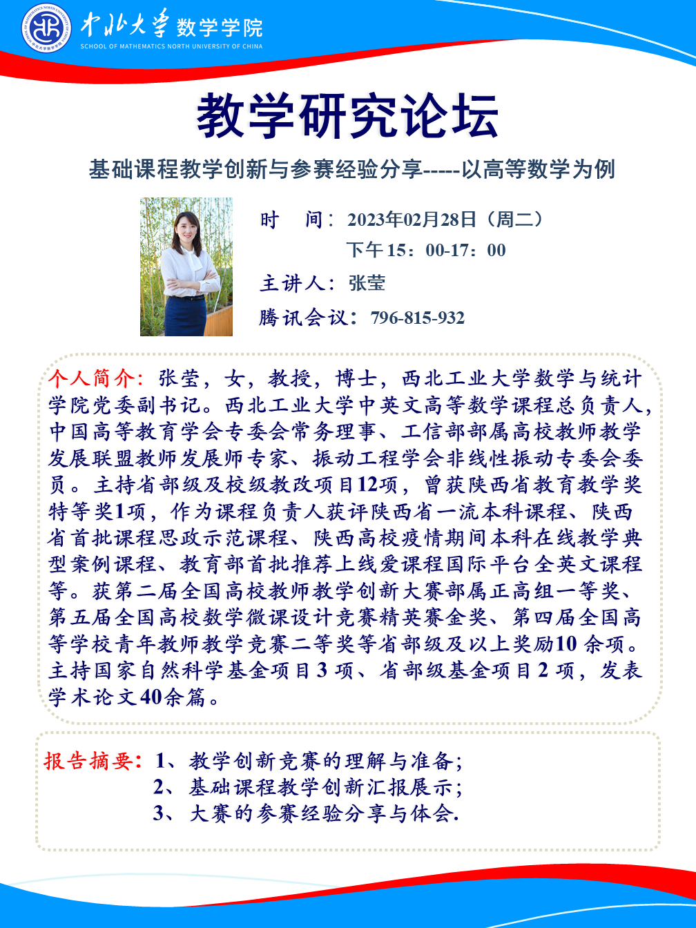 为推动教学创新,培养一流人才,不断提升91国产 教师教学创新能力,2月28日下午3:00,91国产 特邀全国高校教师教学创新大赛一等奖获得者、西北工业大学张莹教授,做了题为“基础课程教学创新与参赛经验分享——以高等数学为例”的教学创新报告。本次论坛在九号楼918线上线下同步进行,学院领导和全体教师参加了讨论学习。论坛由副院长王鹏教授主持。