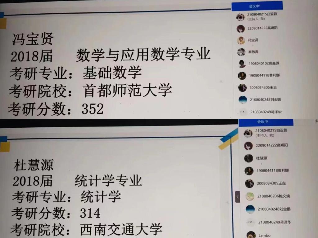 召开考研面试经验分享会,邀请了学院2018级顺利上岸的杜慧源,冯宝贤两位同学分享经验,学院2019级、2020级学生参加了会议。
