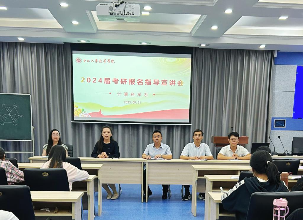 计算科学系进行了2024届考研报名指导宣讲会,计算科学系主任薛震、青年教师李伟强、郑萌萌、张振伟、李烨暄及备考学生共同参会。