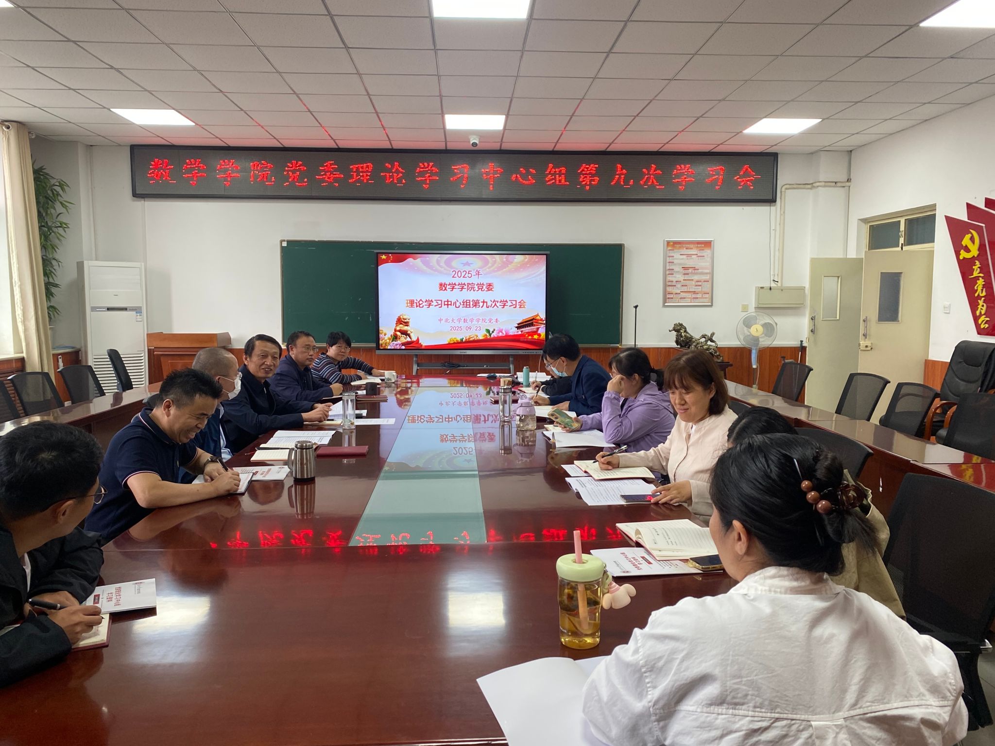 在9号楼六层会议室召开2025年党委理论学习中心组第九次集体学习会议。会议由党委书记薛亚奎同志主持,全体处级干部、党委委员、各党支部书记和教师代表参会。